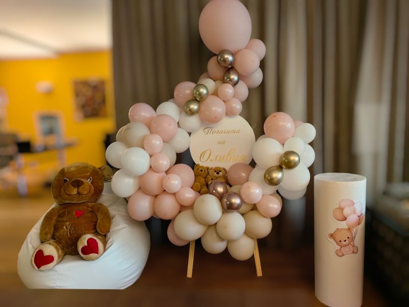 Украса в розово, бяло и златно подходяща за погача, кръщене, посрещане на бебе или първи рожден ден.