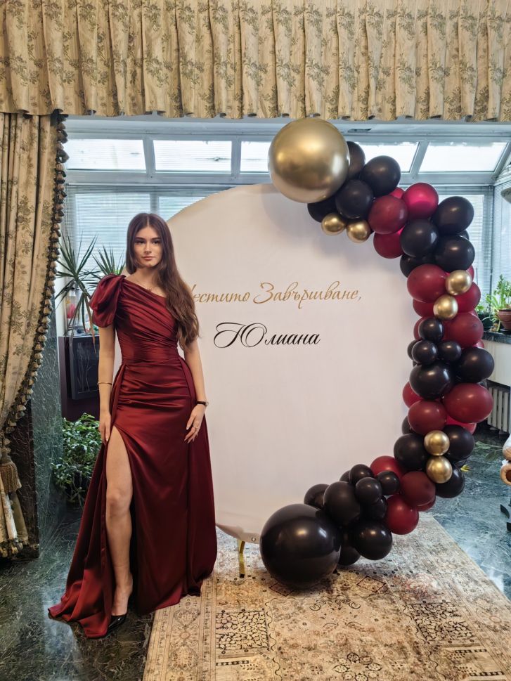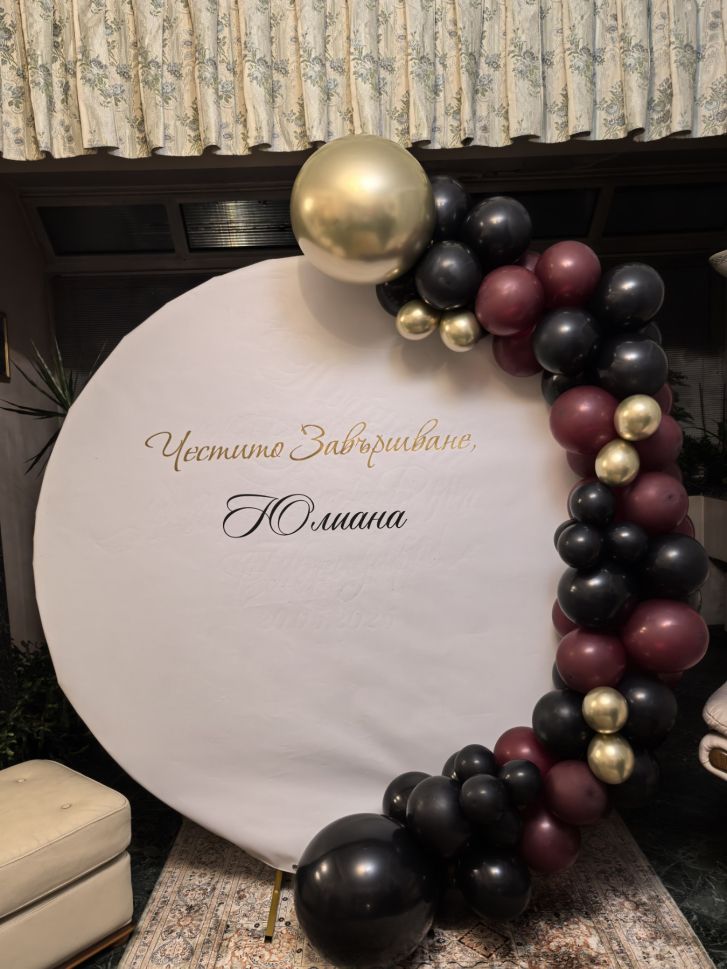 Украса с арка с балони за абитурентски бал, юбилей, рожден ден или кръщение. Украсата можде да бъде изработена в цветове по желание на клиента.