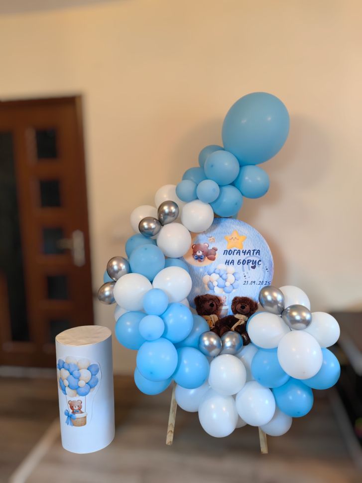Украса за кръщение, погача или рожден ден със статив с балони и табло с персонализиран дизайн и мечета.