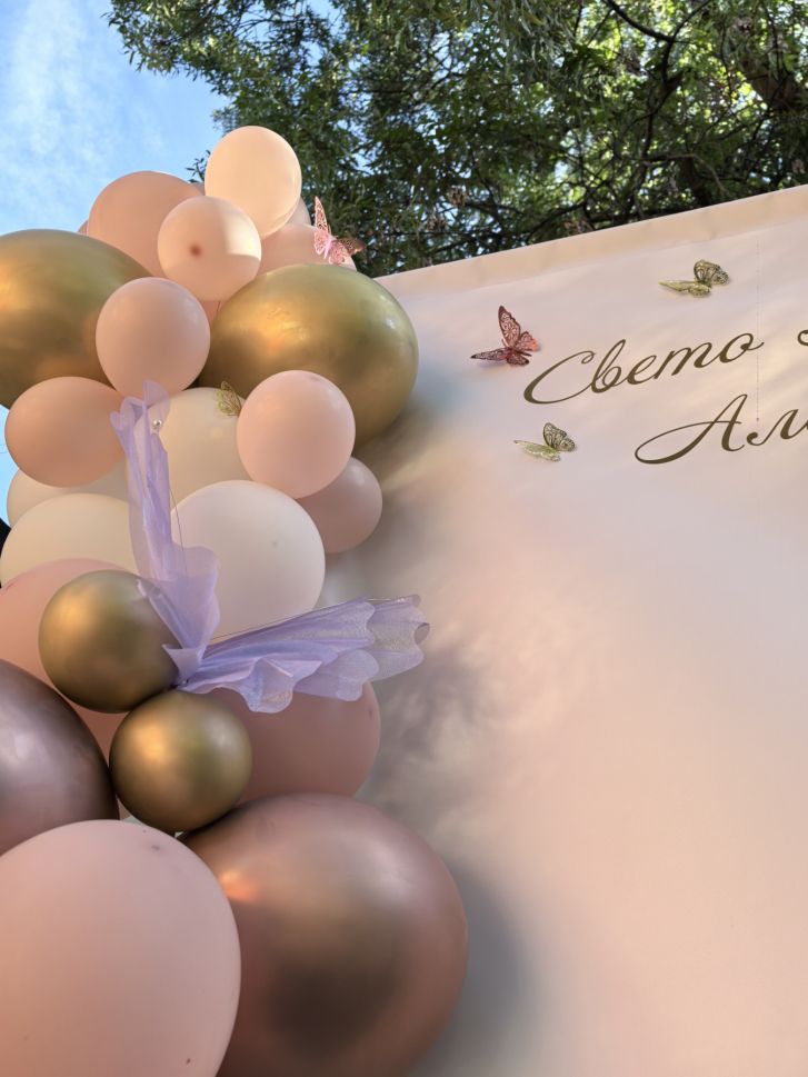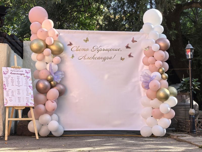 Украса с балони за абитурентски бал, юбилей или кръщение. Украсата можде да бъде изработена в цветове по желание на клиента.