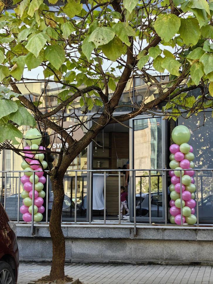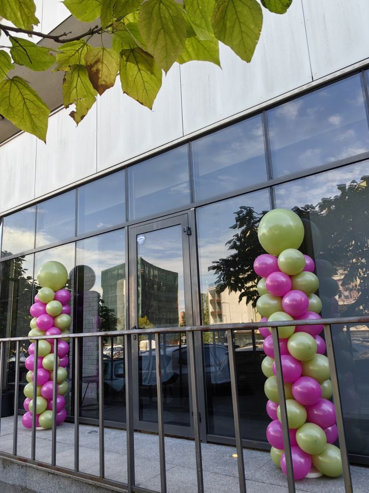 Украса за откриване на търговски обекти с колони от балони в зелено и розово