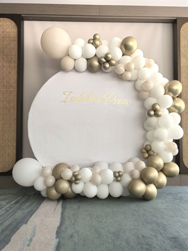 1. Кръгла арка с бял винил с балони в златно и бяло.