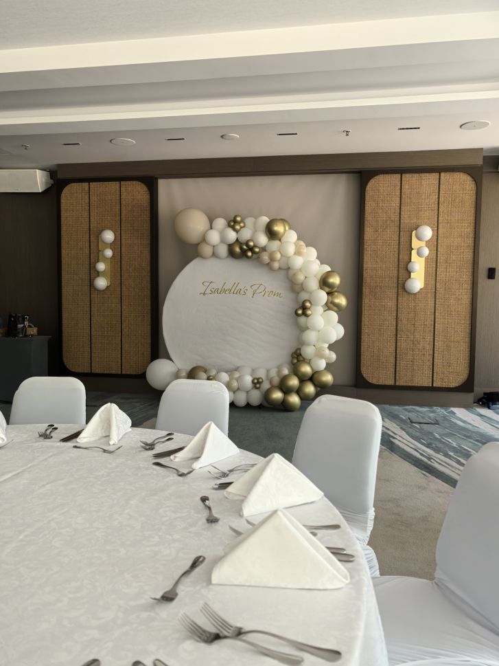 Украса с арка с балони за абитурентски бал, кръщене или юбилей. Украсата можде да бъде изработена в цветове по желание на клиента.