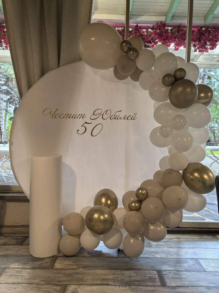 1. Кръгла арка с бял винил с балони в бяло, бежово и злтано.