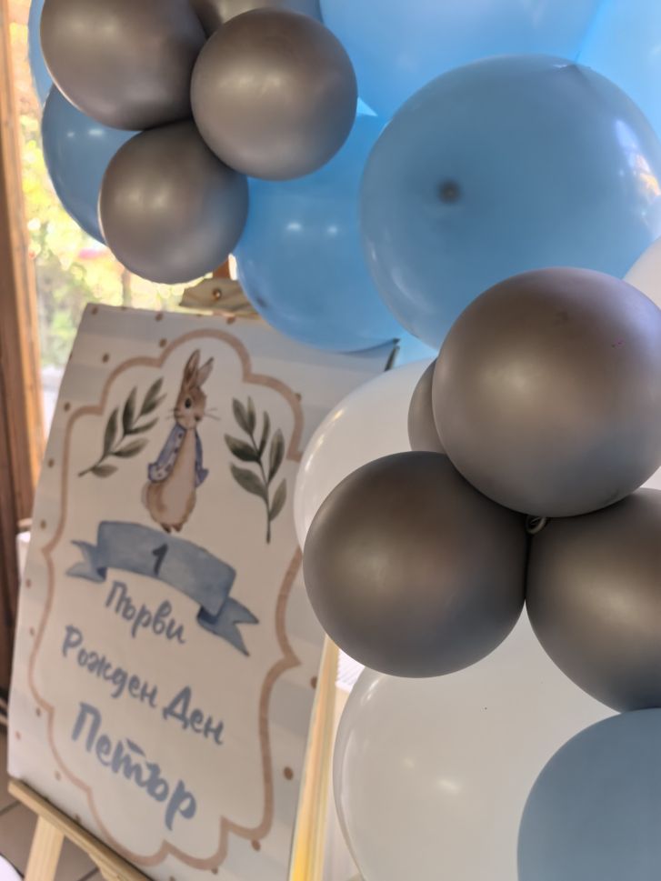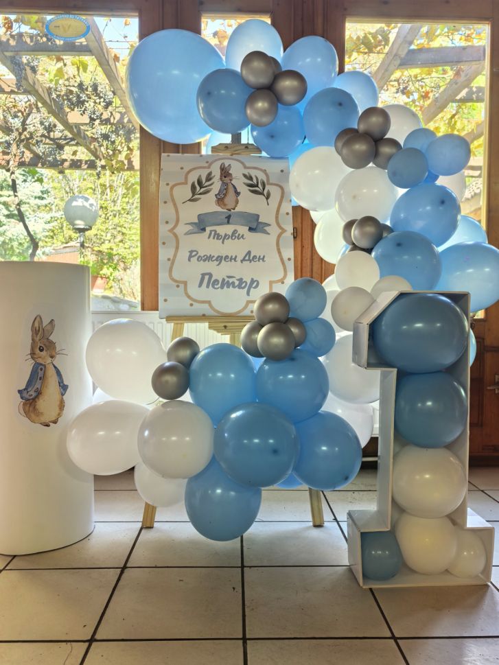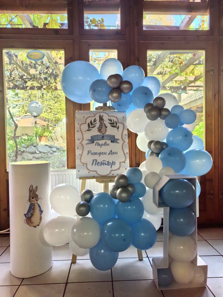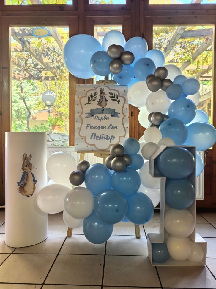 Украса за детски рожден ден със статив с балони и табло с персонализиран дизайн със Зайчето Питър