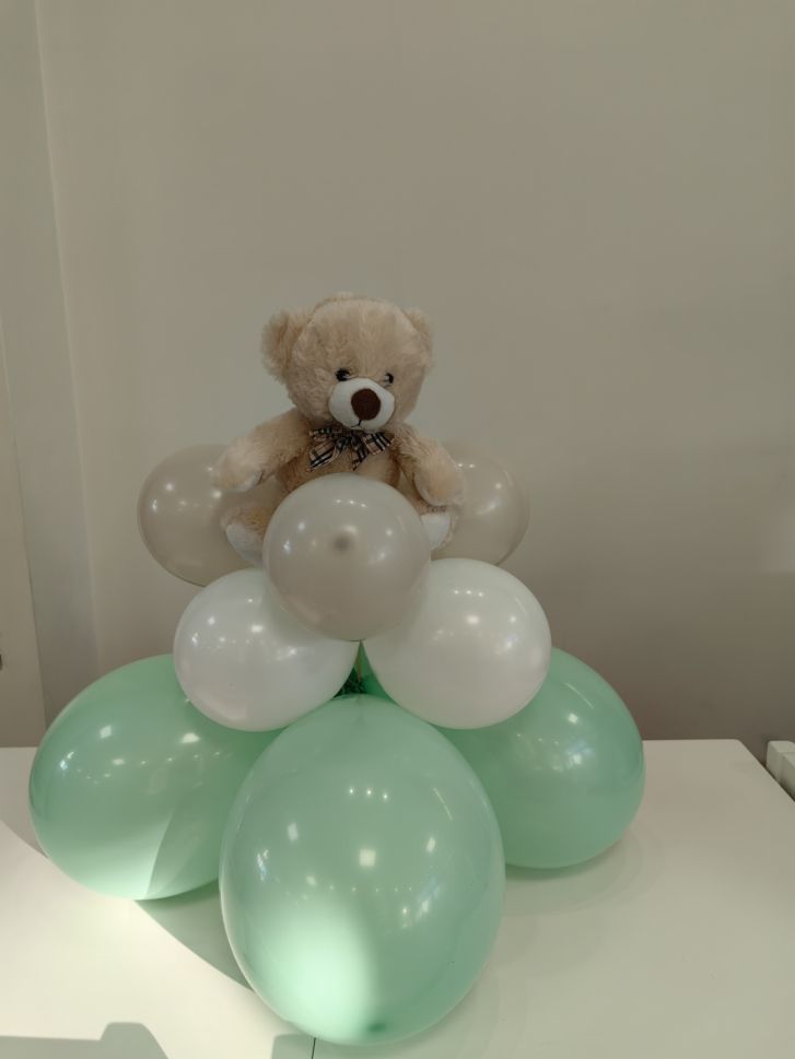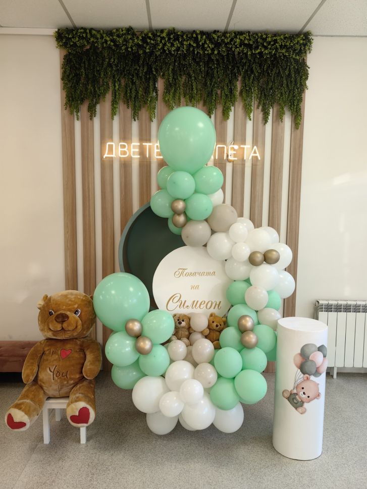 Украса за кръщение, погача или първи рожден ден със статив с балони и табло с персонализиран дизайн и мечета.