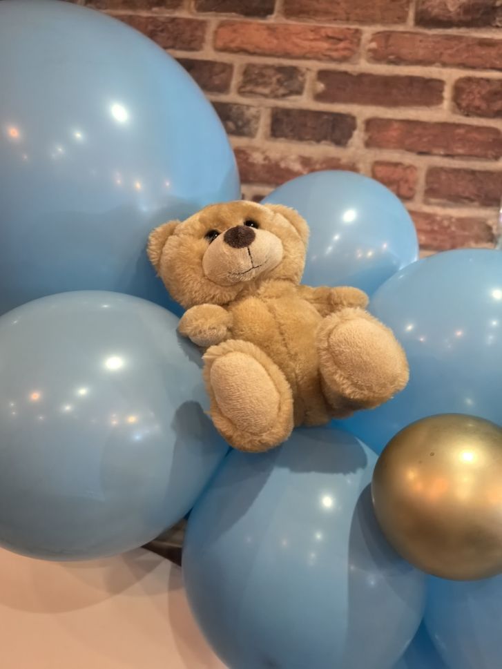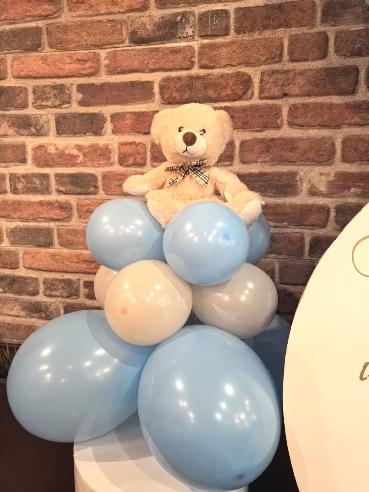 Украса за кръщение, погача или първи рожден ден със статив с балони и табло с персонализиран дизайн и мечета.
