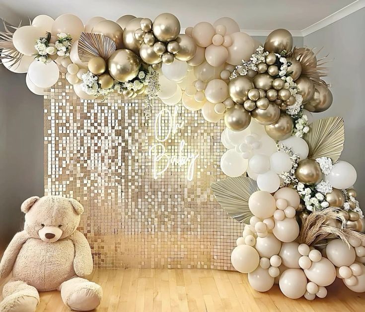 Украса с пайетена стена в златно с балони, цветя и плюшен мечок