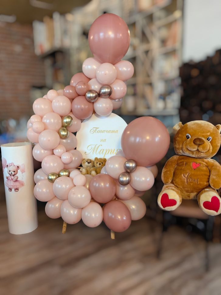 Украса в розово, бяло и златно подходяща за погача, кръщене, посрещане на бебе или първи рожден ден.